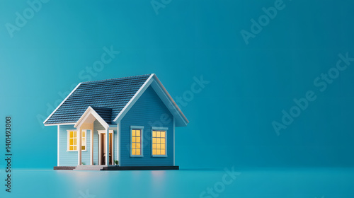 A charming blue miniature house with glowing windows, set against a vibrant turquoise background.