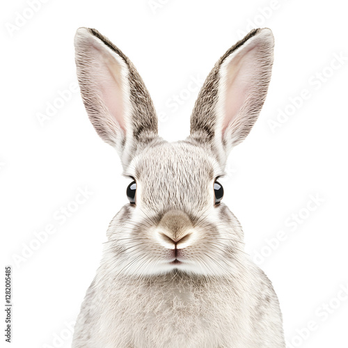 A charming close-up of a rabbit with long ears against a stark white background; the rabbit is looking forward.