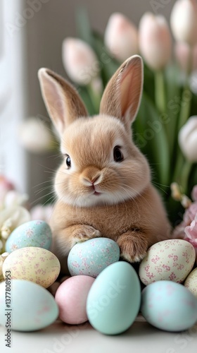 A charming Easter bunny sits among pastel eggs and fragrant flowers in a well-lit studio, capturing the essence of spring festivities