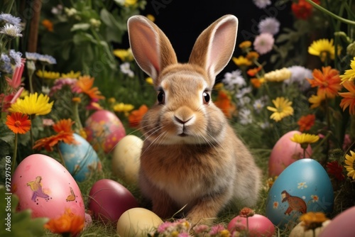 A charming Easter bunny sitting amidst a blooming flower garden, surrounded by hidden Easter eggs