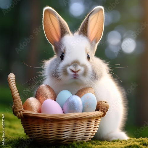 A charming Easter bunny with soft, white fur holding a small wicker basket filled with pastel-colored Easter eggs. The bunny's gentle expression and the warm, inviting colors evoke a sense of joy