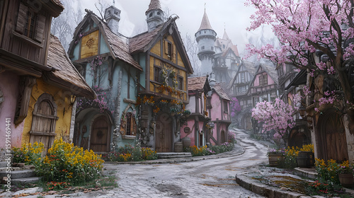A charming, fairytale village nestled in a misty mountain valley. Colorful, half-timbered houses line a winding road, adorned with flowers and ivy. Pink blossoms drift in the air