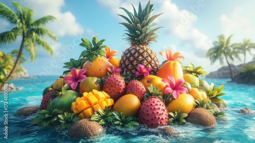 A charming island composed of tropical fruits such as pineapple, coconut, and mango floats in a vibrant azure ocean, rendered in clay with cheerful colors and gentle lighting.