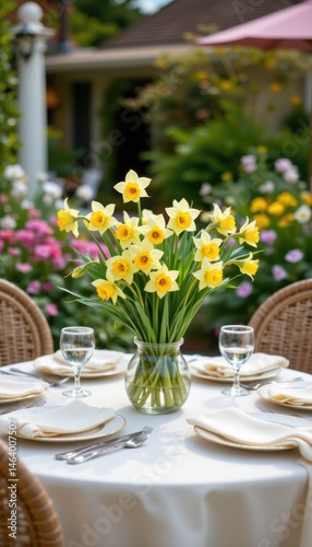 a charming outdoor garden party with a daffodils centerpiece, surrounded by wicker chairs and light bistro table.