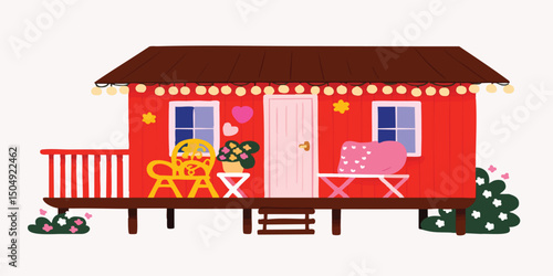 A charming red house with inviting porch adorned with soft decorations, creating a warm and welcoming scene of home.