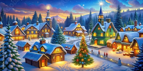 A charming village blanketed in sparkling snow, cozy cottages adorned with twinkling lights, warm windows glowing, and cheerful townsfolk celebrating the magic of a winter wonderland.