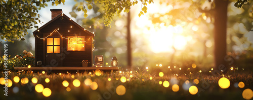A charming wooden house surrounded by glowing lights and lush greenery during a serene sunset, creating a magical atmosphere.