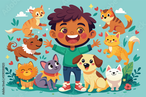 A cheerful cartoon boy is surrounded by a variety of adorable pets, including dogs and cats, in a playful illustration.