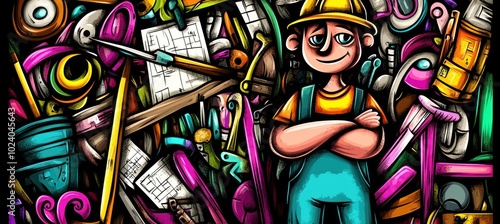 A cheerful character stands among colorful tools and materials, symbolizing creativity and construction.