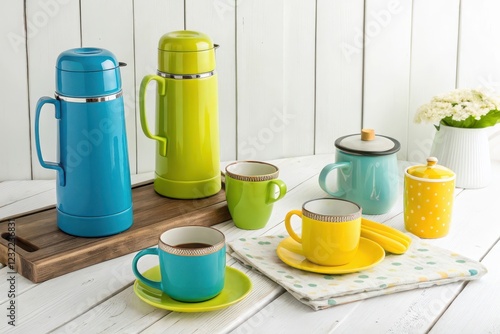 A cheerful display of vibrant teal and lime kitchenware, including thermal carafes and coffee cups, arranged on a wooden tray against a white backdrop.