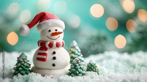 A cheerful snowman wearing a Santa hat and scarf, surrounded by miniature Christmas trees, captures the festive holiday spirit.