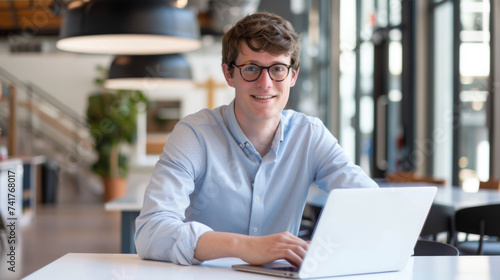 a cheerful young individual is working on a laptop at a bright office space, exuding a vibe of positivity and productivity.