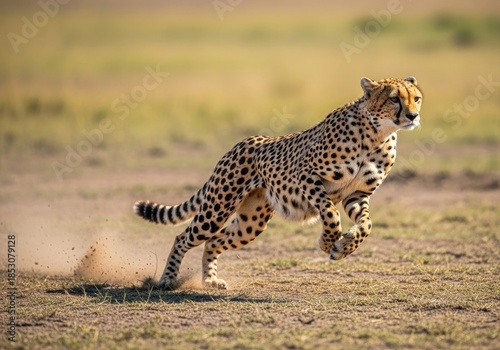 A cheetah in full sprint across the dusty savanna, kicking up dirt as it chases its prey with incredible speed