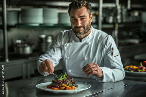 A chef in a professional kitchen placing a garnish on a dish of steak and vegetables, displaying attention to detail and culinary skill.