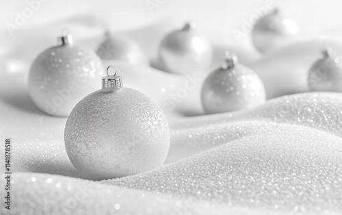 A chic holiday background with monochrome baubles and soft frosted textures on a crisp white surface