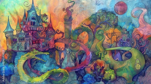 A child's drawing, multicolored, organic shapes, imaginative lines