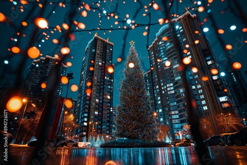 A Christmas tree on the background of a Night city, a landscape with bright New Year's lights sparkling on buildings