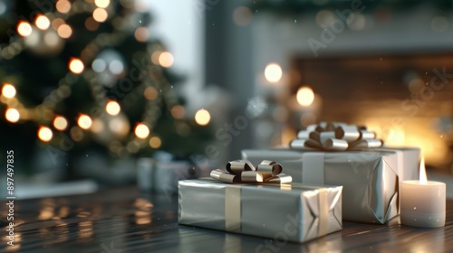 A Christmas tree with lights and a fireplace in the background