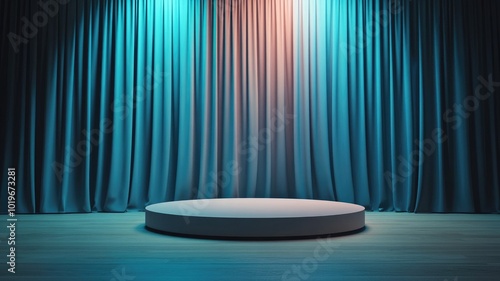 A Circular Platform Illuminated by Blue and Orange Lights Behind Blue Curtains