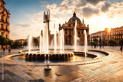A city square adorned with sparkling fountains and surrounded by historical monuments.