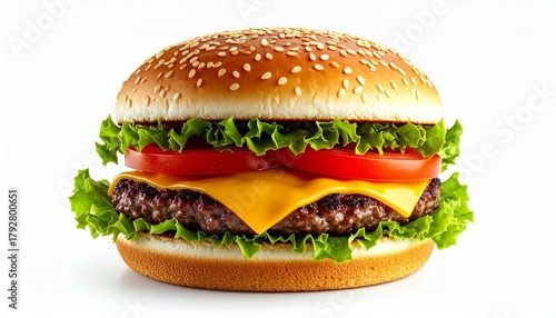 A classic, appetizing cheeseburger on a sesame seed bun, featuring a thick beef patty, melted cheddar cheese, crisp lettuce, and two slices of fresh tomato.