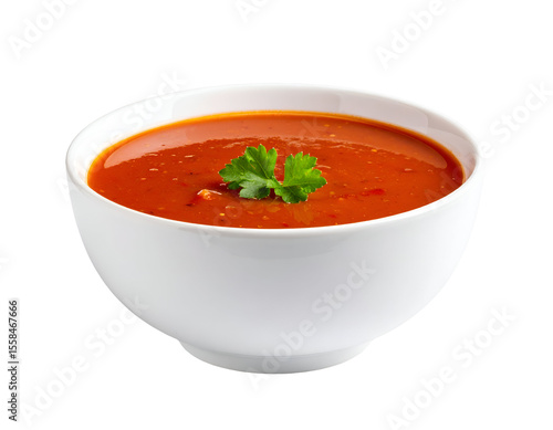 A classic bowl of hearty red soup, elegantly presented and topped with a sprig of fresh green parsley.