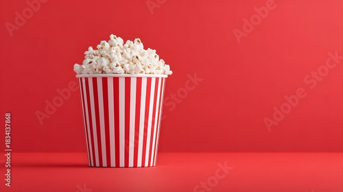 A classic red and white striped popcorn bucket is brimming with fluffy freshly popped corn against a seamless red backdrop perfect for movie nights