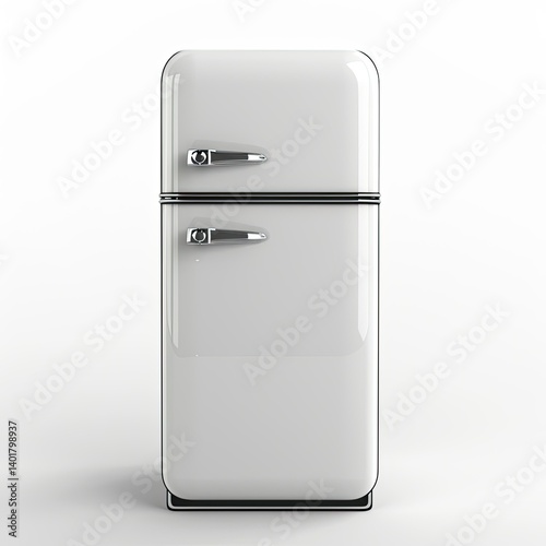 A classic white refrigerator with a retro design and chrome accents. isolated on white background