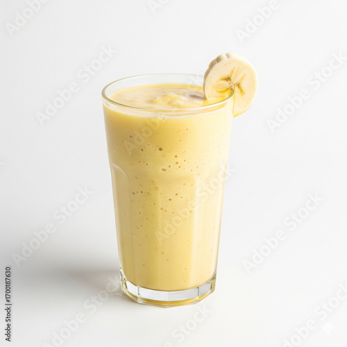 A clean and refreshing shot of a banana smoothie in a glass, isolated on a pure white background