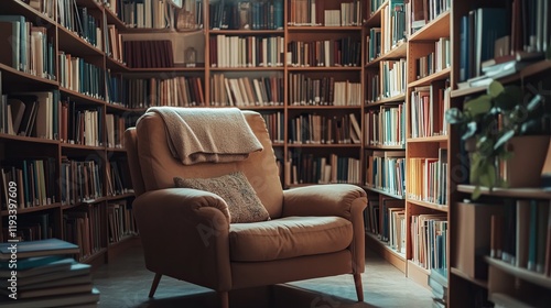 A clean library corner with neatly shelved books and a comfortable armchair
