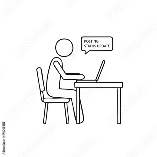 A clean line art illustration depicts a stick figure working on a laptop, actively posting a status update, representing digital communication and social media.