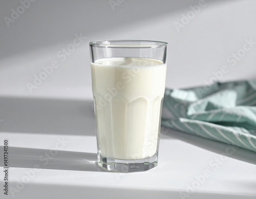 A clear glass filled with creamy milk sits elegantly on a smooth surface, catching light.
