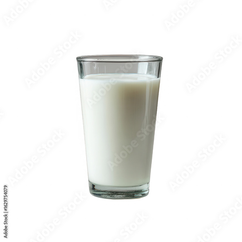 A clear glass filled with fresh milk, showcasing its smooth texture and creamy appearance against a white background.