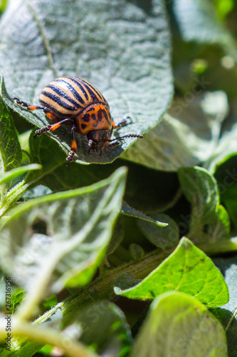 A close up image of the striped Colorado potato beetle that crawls on potatoes and green leaves and eats them.