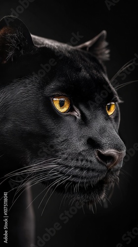 A close up of a black panther's face with yellow eyes