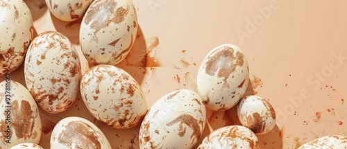 A close up of a bunch of eggs with brown spots on them