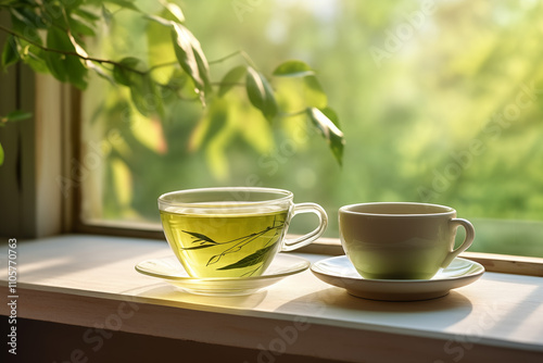 A close up of cup of green tea resting on a windowsill on serene morning scene, perfect for a relaxing start to the day.