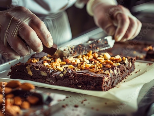 A close up view of a chocolate brownie with crushed nuts on top being prepared by chef hands in the kitchen.