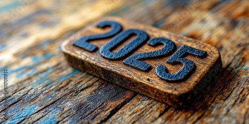 A close-up image of a small wooden block with the number 2025 engraved in dark visual design, resting on a rustic wooden surface with visible textures