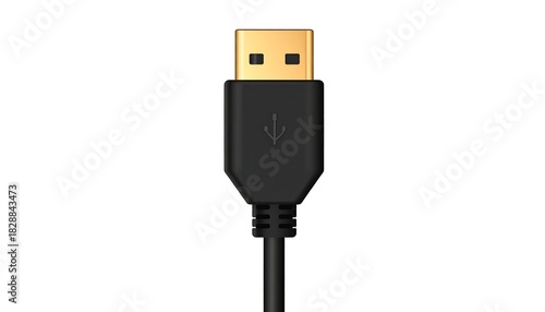 A close-up of a black USB cable with a gold-colored connector and a downward arrow symbol. It sits on a bright white background