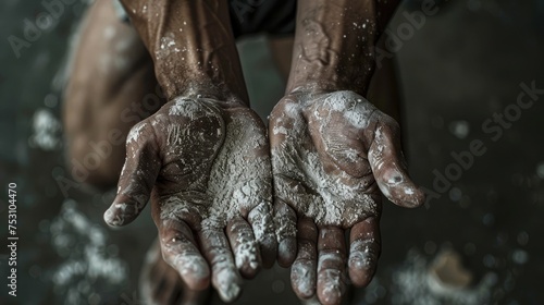 A close-up of a bodybuilder's hands as they chalk up before lifting weights, showing the determination and focus in their eyes.