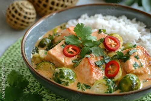 A close-up of a bowl of creamy Thai curry garnished with cilantro, red chili slices