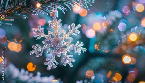 A closeup of a Christmas ornament shaped like a snowflake