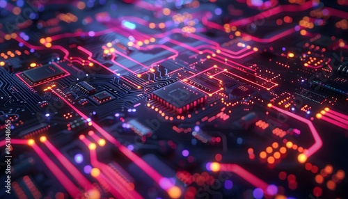 A close-up of a circuit board with glowing red and orange lights. The image creates a futuristic and technological aesthetic.