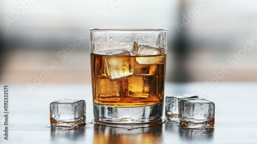 A close-up of a clear glass filled with golden beer and ice cubes, with condensation forming on the outside, set against a blurred background with soft light