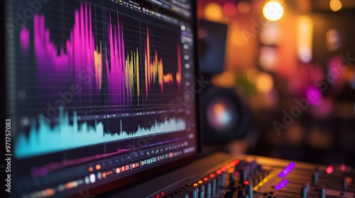 A close-up of a computer monitor reveals colorful waveforms and various audio tracks, highlighting the intricacies of digital audio production in an engaging workspace