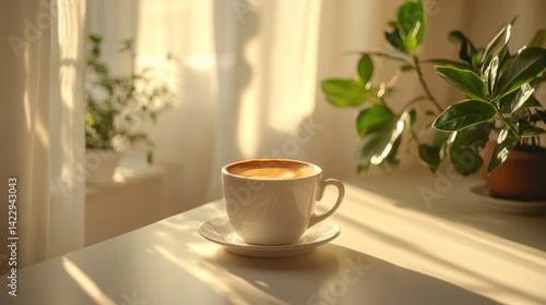 A close-up of a freshly brewed cup of coffee on a white surface, illuminated with soft natural light