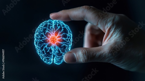 A close-up of a hand touching a glowing blue neuron with a red center, dark background, representing the impact of brain disease on neurons
