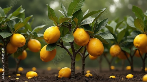 A close-up of a lemon tree full of vibrant, ripe yellow lemons hanging from lush green branches, growing in fertile soil. A symbol of freshness and abundance.