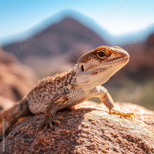 A close-up of a lizard basking on a hot desert rock, its scales reflecting the heat